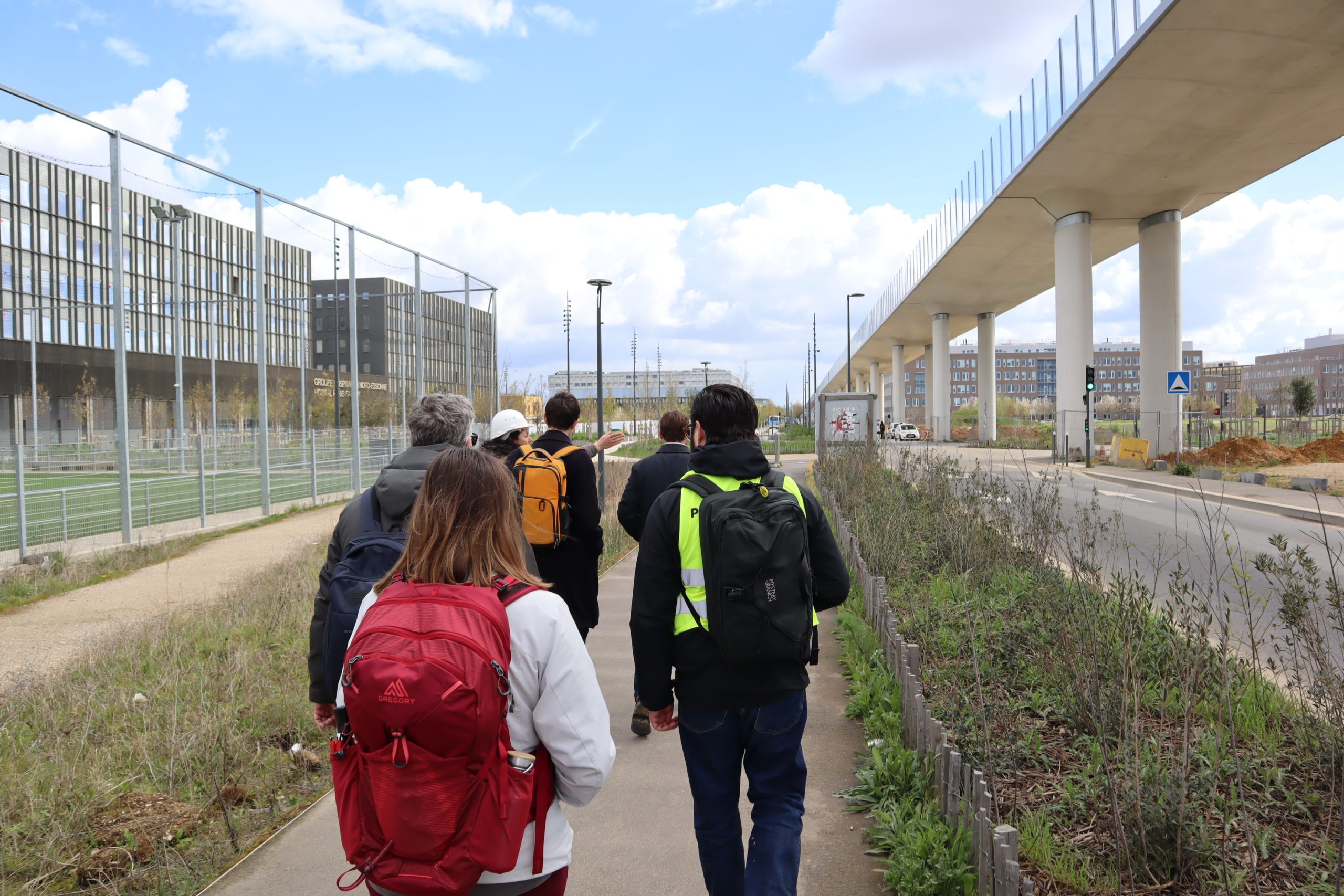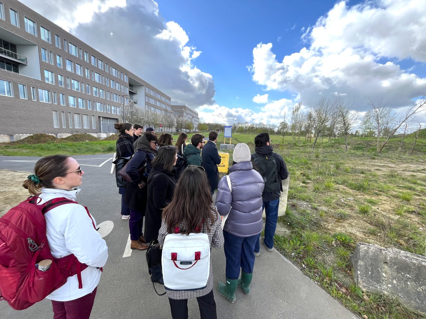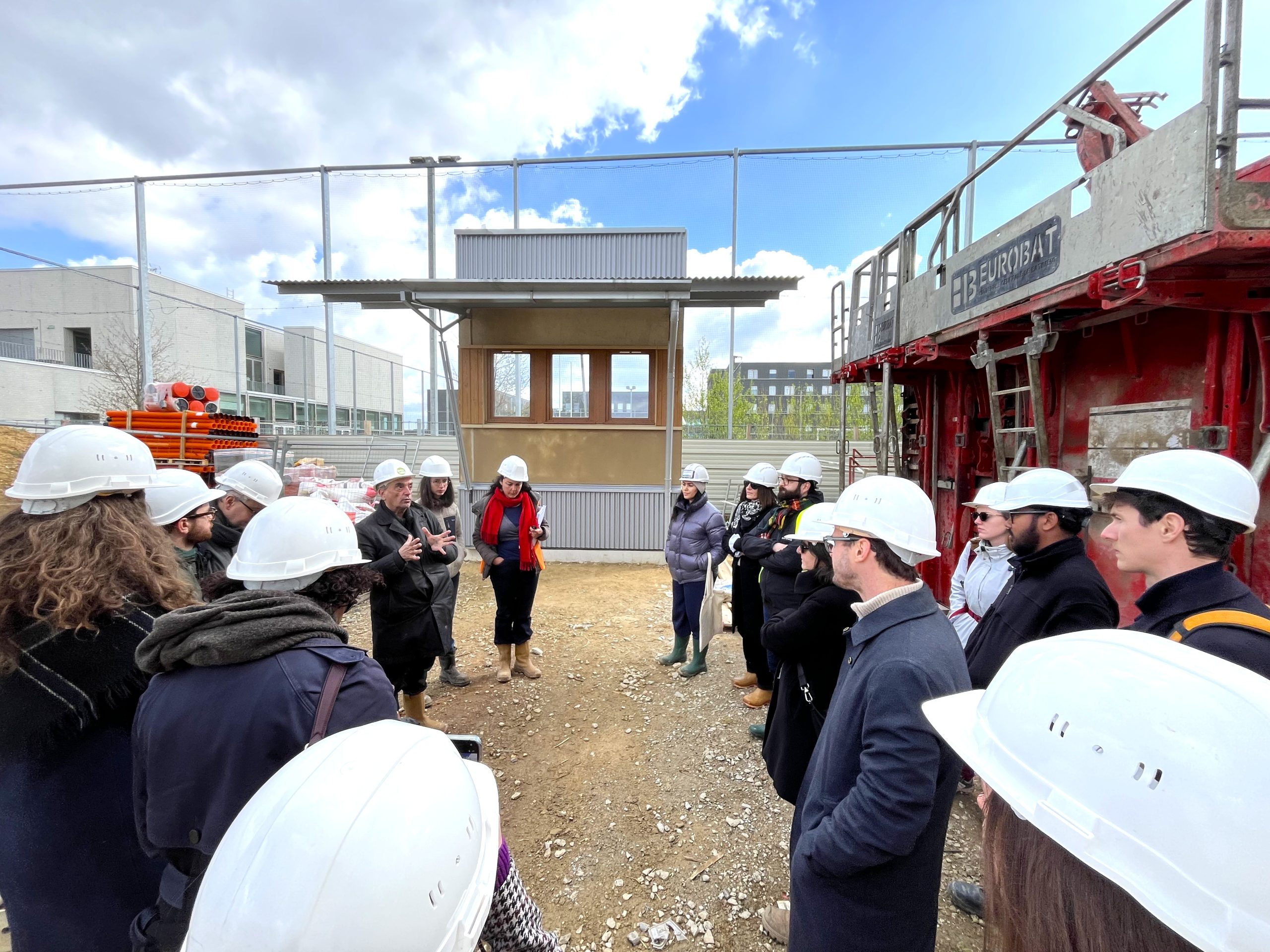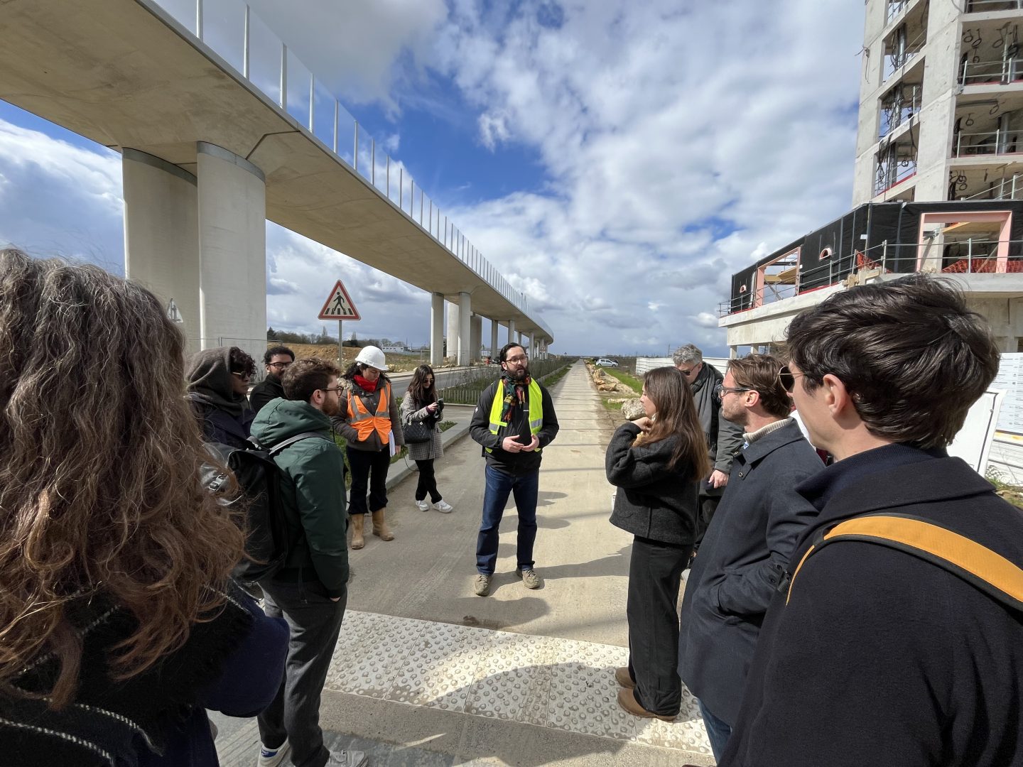 Initiée au Pavillon Réciproque, la visite s’est poursuivie au cœur du quartier de Corbeville, avec un arrêt prolongé sur le chantier de la résidence étudiante QUARTUS.